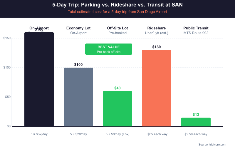 - A 5-day trip could cost anywhere from $45 (off-site, pre-booked) to $200 (on-airport valet).