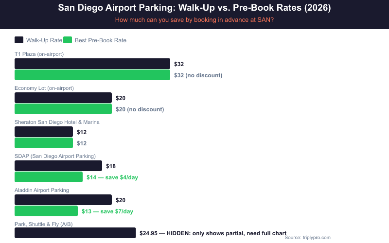- Park, Shuttle & Fly: Walk-up $24.95/day → Pre-book $18.95/day (24% savings)