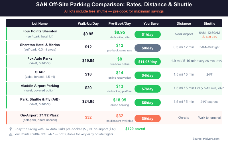 All seven verified off-site lots near SAN include free shuttles. The biggest discounts come from pre-booking — some lots cut 60% off the walk-up rate just by reserving online.