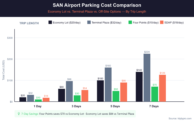| Trip Length | Economy Lot ($20/day) | Terminal Plaza ($32/day) | Off-Site: Four Points ($9.95/day) | Off-Site: SDAP ($18/day) |