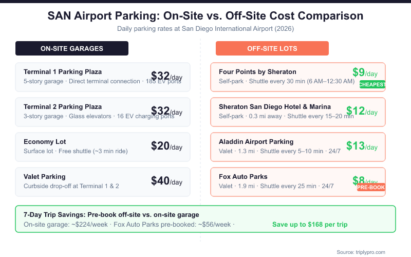 For a full rate comparison across every SAN parking option, see our San Diego airport parking prices guide.