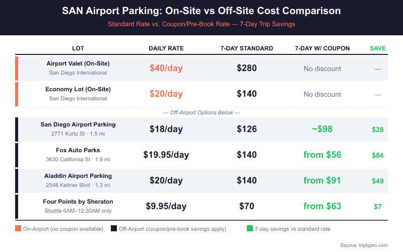 | San Diego Airport Parking (SDAP) | $126 | ~$105 (17% off) | ~$21 |