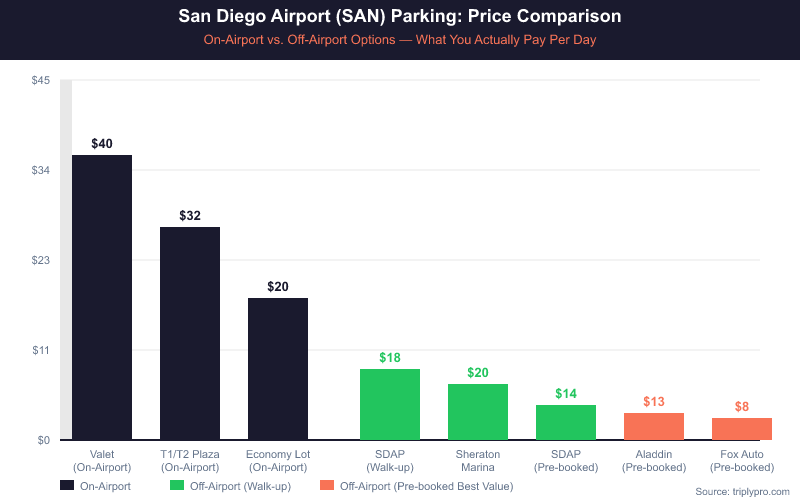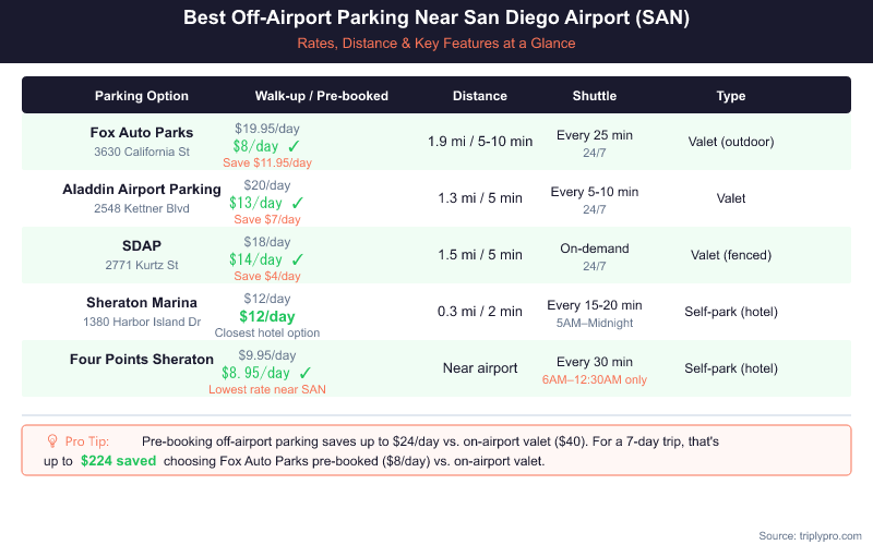 | San Diego Airport Parking (SDAP) | $18/day | Off-site valet; free shuttle 24/7 |