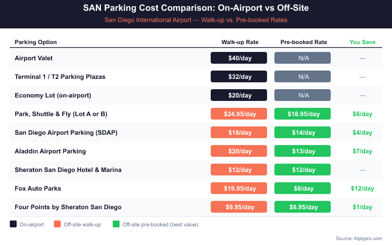 Pre-booking is the single biggest factor in getting a low rate. Walk-up rates at off-site lots can run significantly higher. Fox Auto Parks, for example, lists walk-up rates well above their pre-booked online rate of $8/day. For a deeper look at the cheapest options and how to find discount codes, check our guide on San Diego airport parking cheap options.