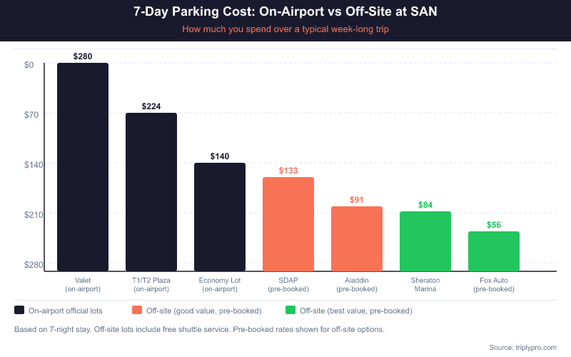 Off-site lots can save you up to 72% compared to on-airport garages. For a 7-day trip, that's a savings of over $160. The tradeoff is a short shuttle ride — typically 5-10 minutes — but every verified off-site lot at SAN includes a free shuttle. Here's how the cheapest options stack up: