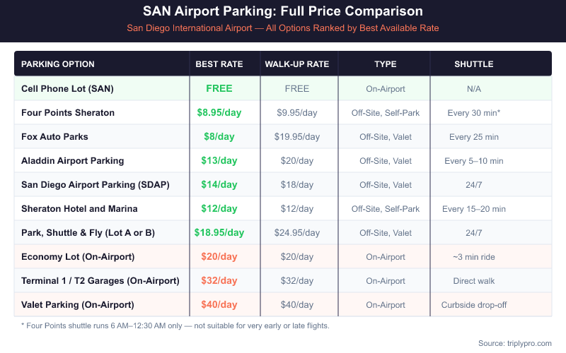 Below is a side-by-side view of every SAN parking option, from cheapest to most expensive per day. Use this to find the right fit for your trip length and budget.