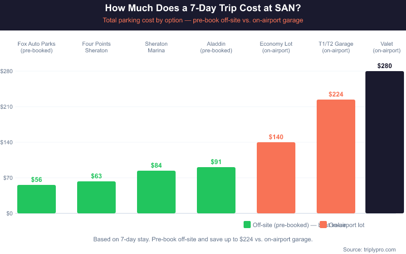 - Off-site lots: $8.95–$24.95/day across 7 verified providers near SAN