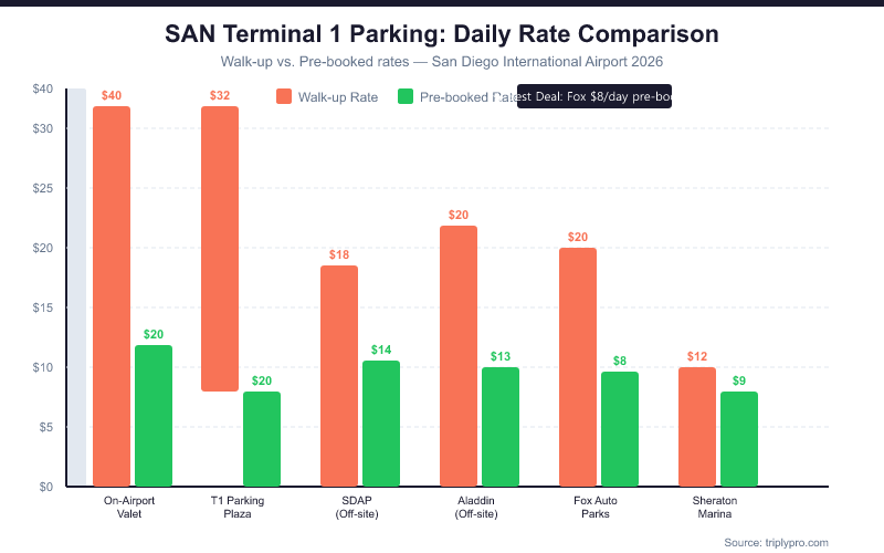 - Fox Auto Parks pre-books from $8/day — one of the lowest verified rates near SAN.