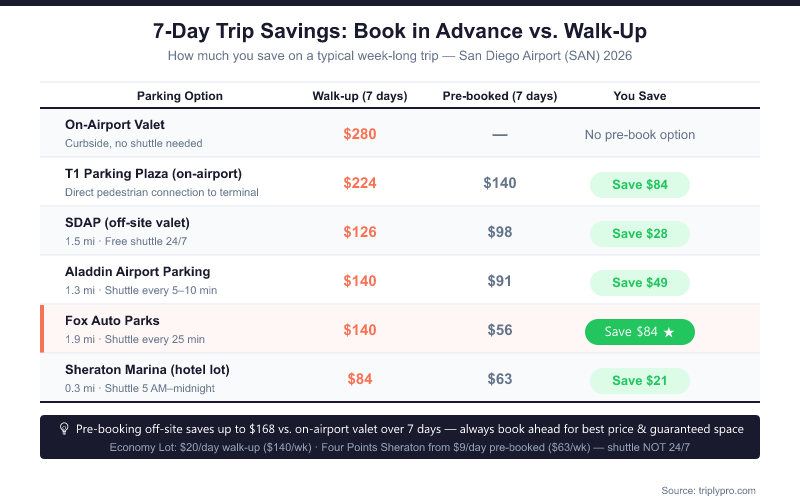 Important: Promo code pricing requires pre-payment online. Walk-up rates at the lot are always higher. For example, San Diego Park, Shuttle & Fly charges $24.95/day at the gate but $18.95/day when booked online — that's a $6/day savings just for reserving in advance.