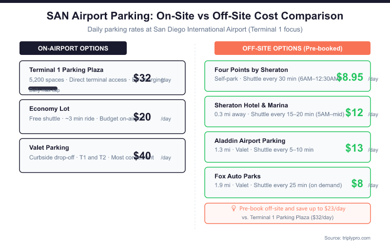 San Diego Airport Terminal 1 parking costs $32/day at the Terminal 1 Parking Plaza or $20/day at the Economy Lot. Off-site lots start at $8.95/day with free shuttles.