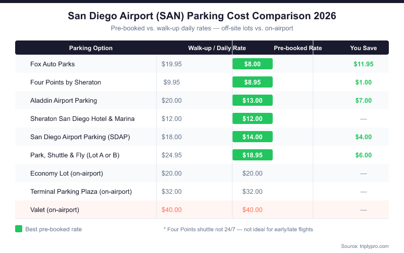 The gap between on-airport and off-site pricing is stark. Booking the Four Points by Sheraton San Diego through cheapairportparking.org gets you to $8.95/day — that's 72% less than the $32/day Terminal 1 Parking Plaza rate. For a 7-day trip, off-site parking saves you roughly $162 before shuttle time is even factored in. For a deeper look at every rate, see our San Diego airport parking prices guide.