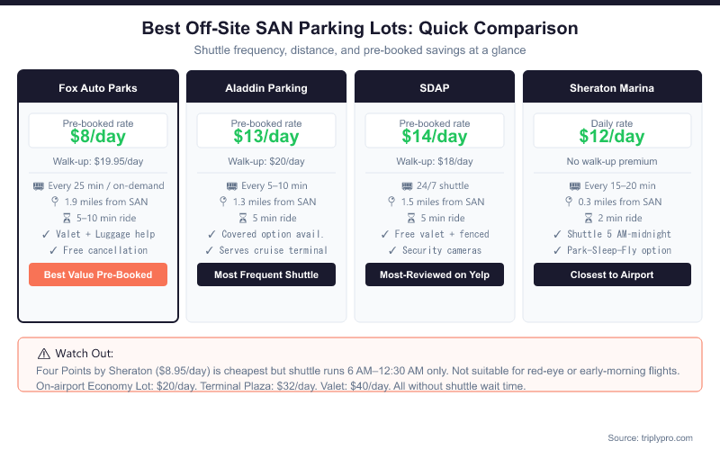 Reddit threads also warn about one trap: some third-party listing sites show low teaser rates that jump at checkout with added fees. Locals recommend booking directly through the lot's website or a trusted aggregator. Compare verified SAN parking rates starting at $8.95/day on Triply — all fees included before you confirm.