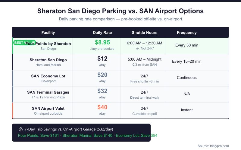 The Sheraton San Diego Hotel and Marina charges $12/day for self-parking (verified April 2026). The Four Points by Sheraton San Diego costs $9.95/day walk-up or from $8.95/day when pre-booked. On-airport garages charge $32/day — so the savings are significant on any trip longer than a few days.