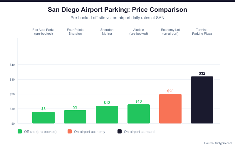 - SAN on-airport garages: $32/day — no shuttle needed, but costs 45-70% more than most off-site options.