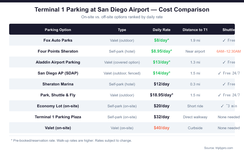 Booking off-site lots in advance through a comparison tool can save you up to 72% versus on-airport valet rates. For a deeper look at how rates stack up across all SAN lots, read our San Diego airport parking cost breakdown for 2026.