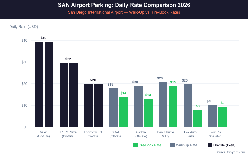 The SAN Economy Lot at $20/day is the cheapest on-airport option, but it still costs more than twice the best off-site pre-book rates. For more strategies, check our full guide to cheap San Diego Airport parking.