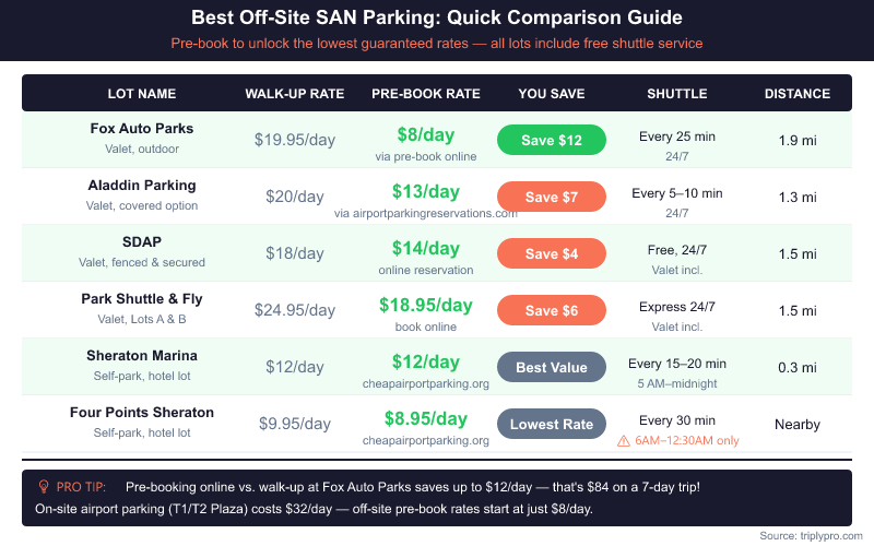 Booking 3-7 days in advance typically unlocks the best pre-book rates at SAN off-site lots. Some platforms show better pricing at 14+ days out, especially during busy travel seasons.
