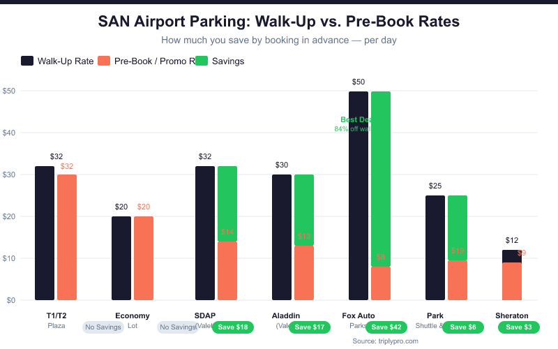 For a full breakdown of every off-site lot's features and reviews, see our guide to San Diego airport off-site parking lots and rates. On a 7-day trip, choosing Fox Auto Parks at $8/day over an on-airport garage at $32/day saves you $168.