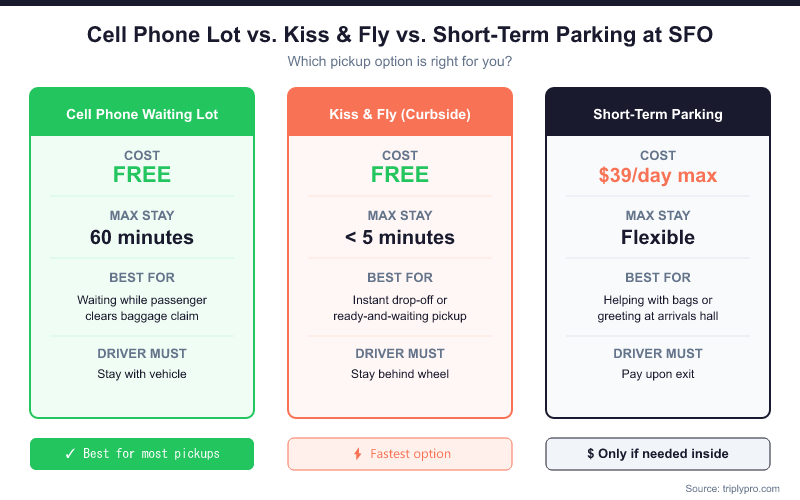 The Kiss & Fly area works only if your passenger is already standing at the curb when you arrive. It is not a waiting zone — you must keep moving if the passenger isn't there yet. The Cell Phone Lot is always the right choice when you need to hold position for a few minutes before heading to the curb.