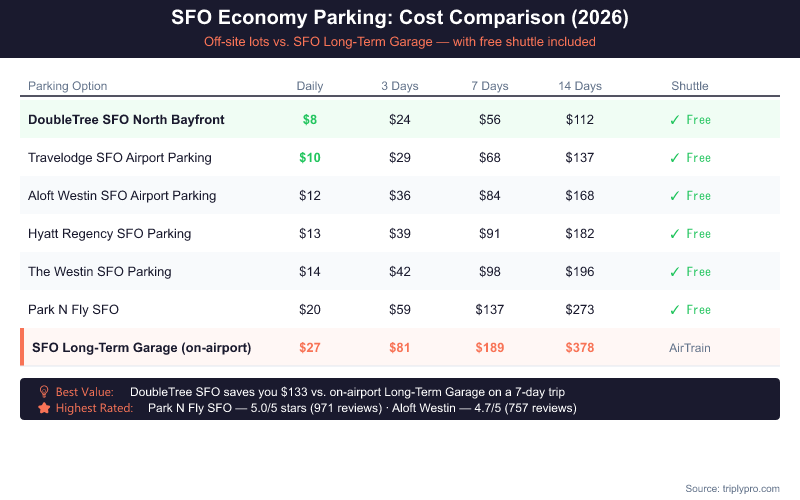 - Cheapest off-site rate: DoubleTree SFO North Bayfront at $8/day with free shuttle — 70% less than ParkFAST on-airport