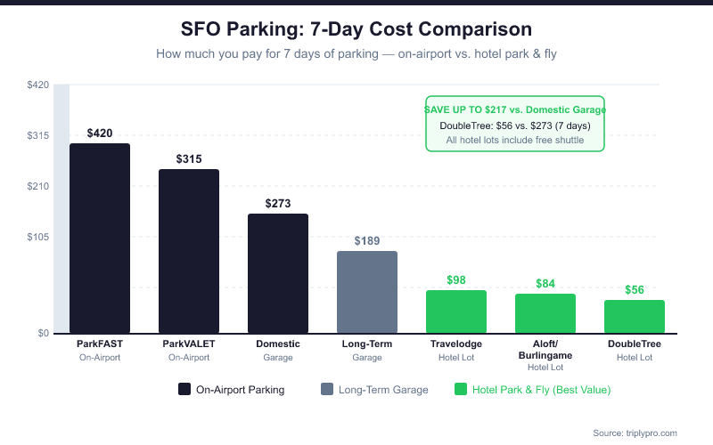 - On-airport comparison: SFO's own Domestic Garage costs $39/day — up to 79% more than the cheapest hotel option