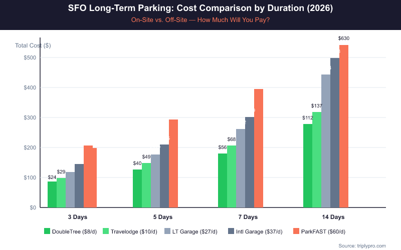 On a 7-day trip, DoubleTree SFO North Bayfront saves you $133 over the on-site Long-Term Garage. Over 14 days, that gap grows to $266. Even the Hyatt Regency — a hotel lot with a restaurant — costs $196 less over 14 days than parking on-site. These figures are based on current Triply partner rates (verified April 2026).
