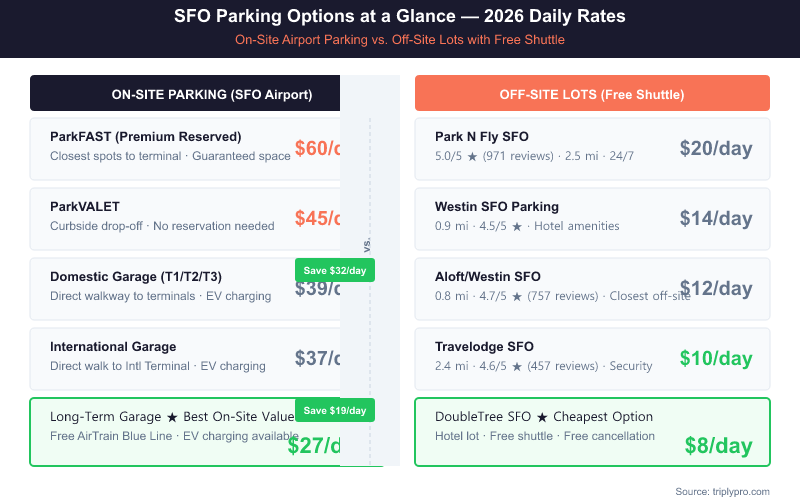 Off-site lots beat on-airport pricing by a wide margin. The cheapest verified option — DoubleTree SFO North Bayfront — costs just $8/day, compared to $27/day at the Long-Term Garage. That is a 70% saving for a comparable experience with free shuttle included.