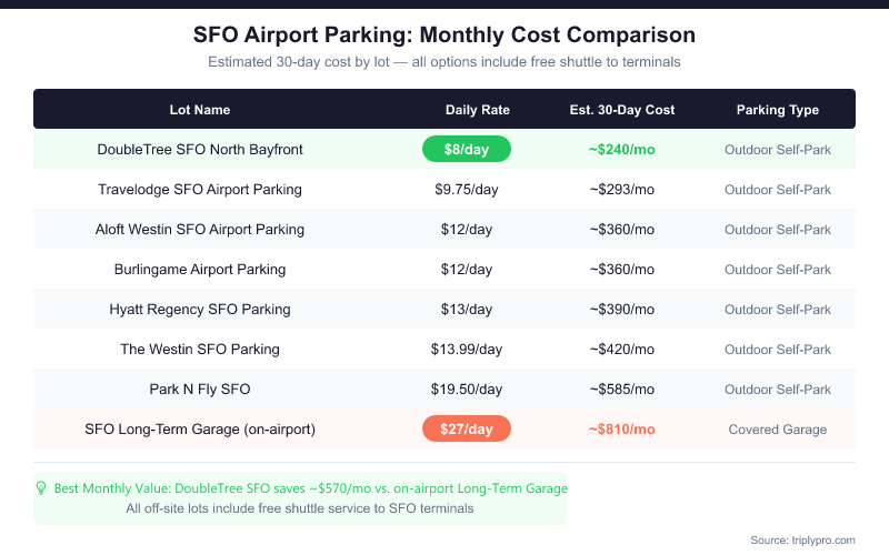 Parking at DoubleTree SFO North Bayfront for a full month costs around $240 — that's a 70% saving versus the on-airport Long-Term Garage. Even mid-range options like Hyatt Regency SFO save you roughly $420 over 30 days. If you're parking for multiple weeks each month, off-site is almost always the better financial choice.
