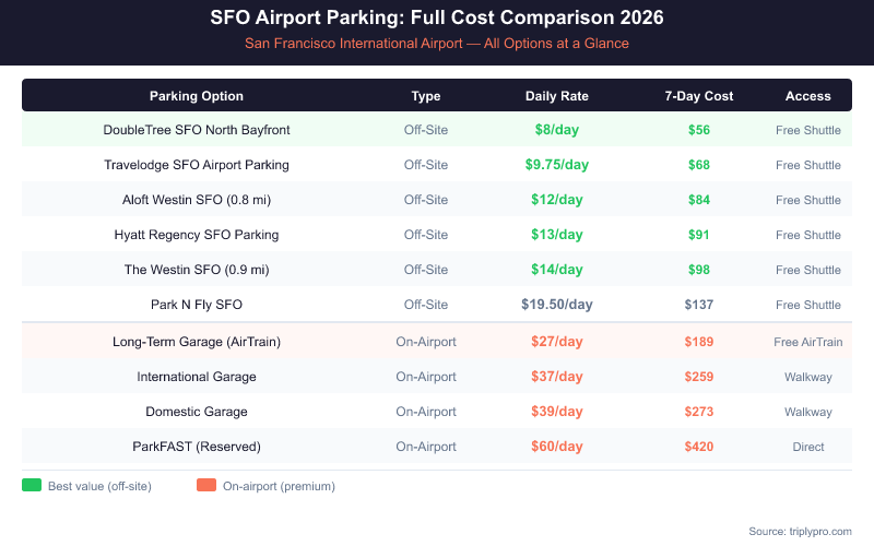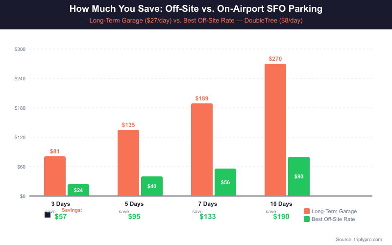 Off-site parking at SFO can save you a significant amount of money, especially for trips of three days or longer. The cheapest on-airport option is the Long-Term Garage at $27/day. The cheapest off-site lot — DoubleTree SFO North Bayfront — costs just $8/day. That's a difference of $19 per day.