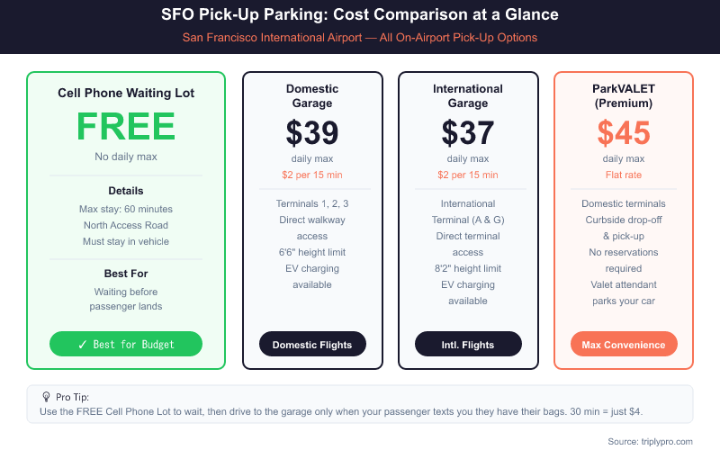 For most pick-ups, the Cell Phone Waiting Lot is the right answer. It's free, low-stress, and puts you just minutes from every terminal. Compare SFO parking options and rates on Triply — off-airport lots start at $8/day if you need longer-term parking near SFO.