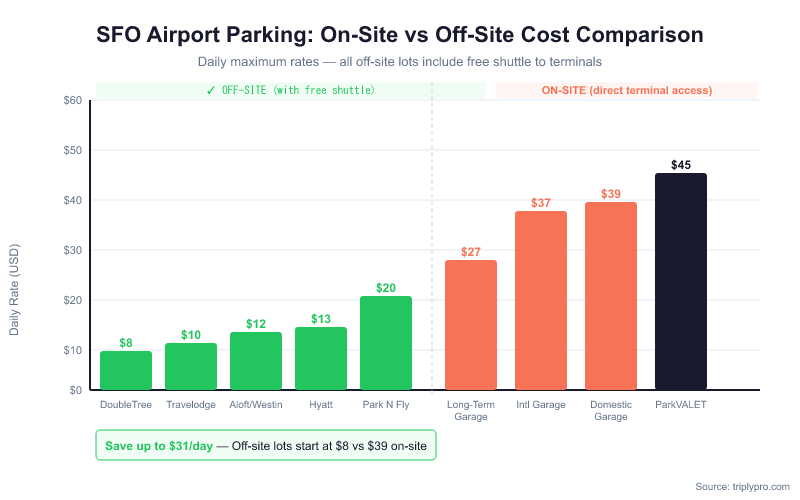 For a 7-day trip, a traveler using the DoubleTree SFO North Bayfront at $8/day pays $56 total. The same trip in the Domestic Garage costs $273. That's a $217 saving — enough to cover a checked bag, airport meals, and transport on arrival.