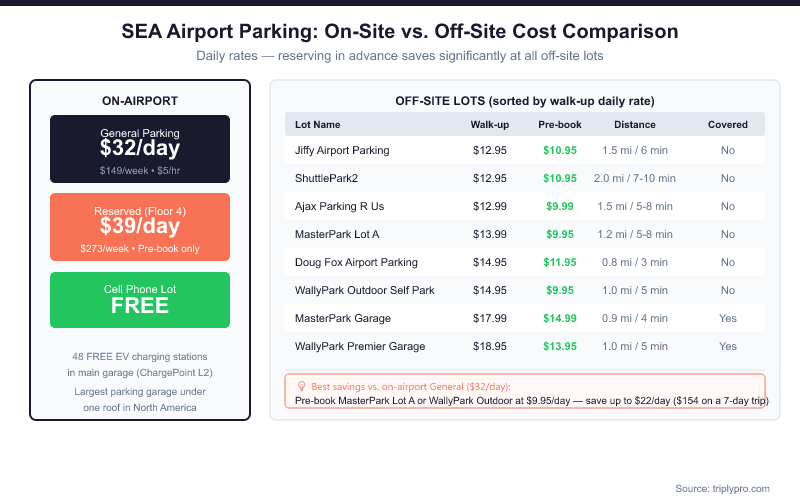 SEA parking rates in 2026 range from $32/day (General) to $39/day (Reserved) on-site, while off-site lots near SeaTac start at just $12.95/day with free shuttles.