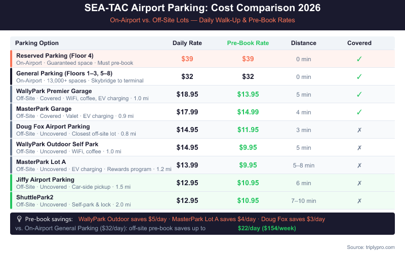 For a full breakdown of every on-airport rate — including hourly costs and overflow options — see our Seattle Airport Parking Rates: Full 2026 Cost Breakdown.