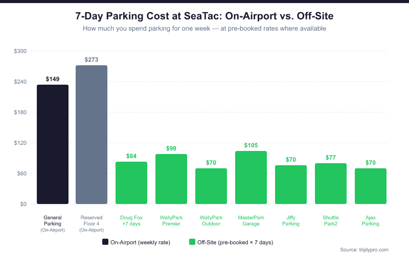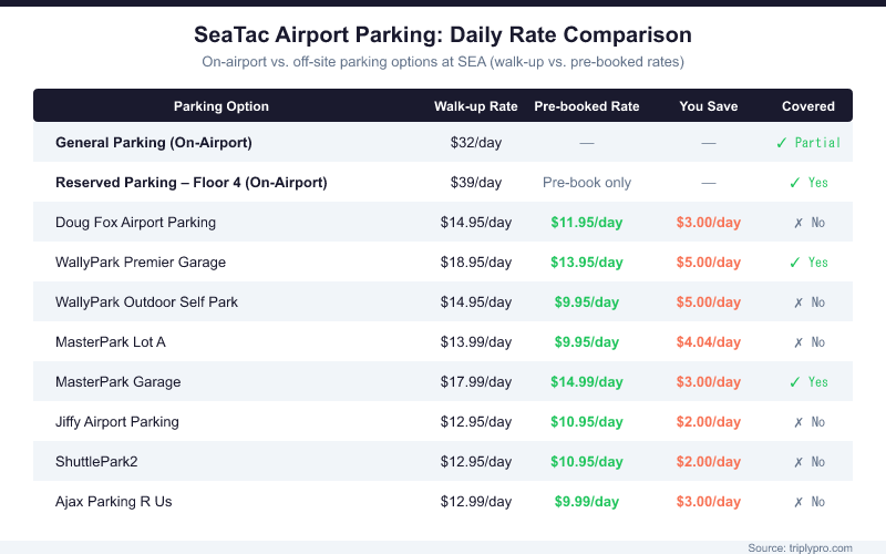 Here is a full side-by-side comparison of every named parking option near Seattle-Tacoma International Airport, including on-airport and off-site facilities. Rates are current as of April 2026 per verified lot and Port of Seattle data.