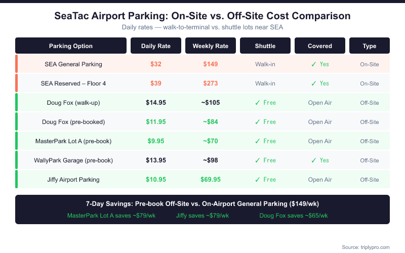 - Best speed + value: Doug Fox Airport Parking at $14.95/day. It's the oldest and closest off-site lot to SEA — just 3 minutes from the terminal by shuttle. Hard to beat for early flights.