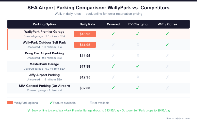 Compare WallyPark SEA rates against all off-site lots — from $12.95/day — on Triply.