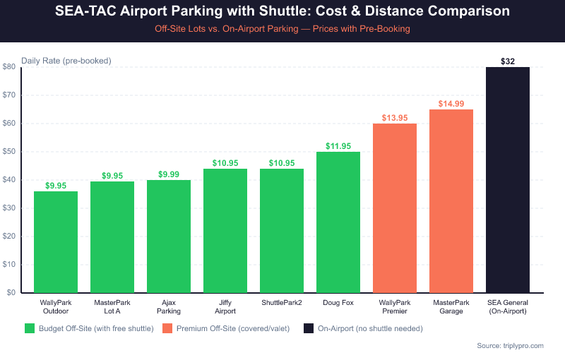 For a 7-day trip, the savings add up fast. Jiffy Airport Parking at $12.95/day works out to about $90.65/week. The on-airport garage costs $149/week — that's a $58 difference for the exact same trip. For longer stays, check the full Seattle Airport weekly parking rate breakdown to see which lot saves the most over 7+ days.