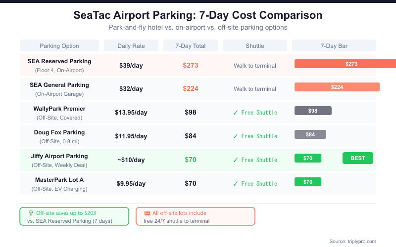 For a 7-day trip, a hotel park-and-fly package at $160 total includes your room and parking — versus $224 for on-airport parking alone with no hotel. That's a savings of $64 or more just on parking, and you get a comfortable night's stay included. Off-site lots like Jiffy Airport Parking or ShuttlePark2 at $12.95/day remain the cheapest pure-parking option if you don't need a hotel room. For a full rate comparison across all SEA parking options, see our Seattle Airport Parking Rates: Full 2026 Cost Breakdown.