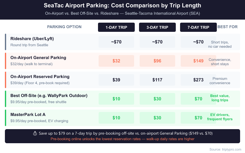 Rideshare estimates based on typical Seattle-to-SEA fares. Actual costs vary by surge pricing and pickup location. Parking rates pre-tax.