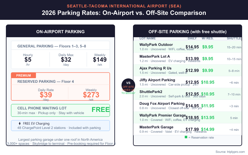 SEA parking costs range from free (Cell Phone Lot) to $39/day (Reserved Parking) on-airport, and from $12.95/day to $18.95/day at off-site lots (verified April 2026). The right option depends on your trip length and how close you want to park.