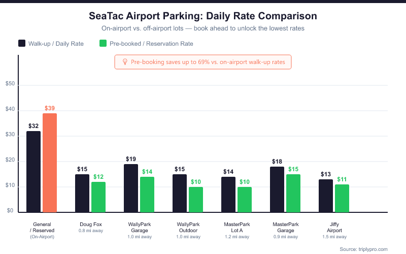 Seattle airport parking prices are the per-day or per-hour fees charged to leave your car at or near Seattle-Tacoma International Airport (SEA) while you fly. In 2026, on-airport General Parking costs $5/hour or $32/day, while Reserved Parking runs $39/day. Off-airport lots start as low as $12.95/day — that's up to 60% cheaper than the on-site garage, and every major off-airport lot includes a free 24/7 shuttle to the terminal.