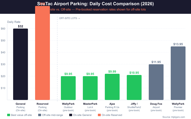 All rates verified April 2026 per the Port of Seattle official parking information page and individual lot websites. Off-site lots include free shuttle service in the listed price — there are no hidden shuttle fees.