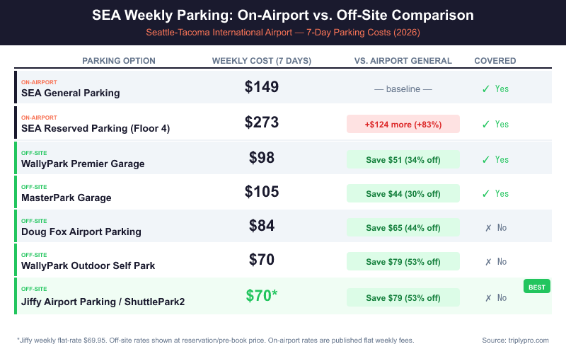 The cheapest weekly option — Jiffy Airport Parking or ShuttlePark2 at $90.65/week — costs 39% less than on-airport General Parking and 67% less than Reserved Parking. Both include free 24/7 shuttles. For more detail on off-site lot options, see our guide to Seattle Airport off-site parking rates and lot comparisons.