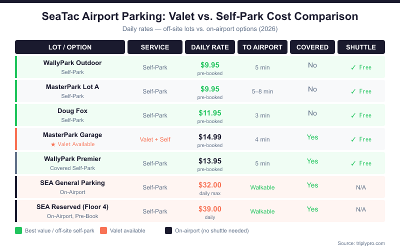 One important note: MasterPark Garage offers both valet and self-park at the same $17.99/day rate. If you book there, you can choose at drop-off. That makes it the most flexible premium option near SEA right now.