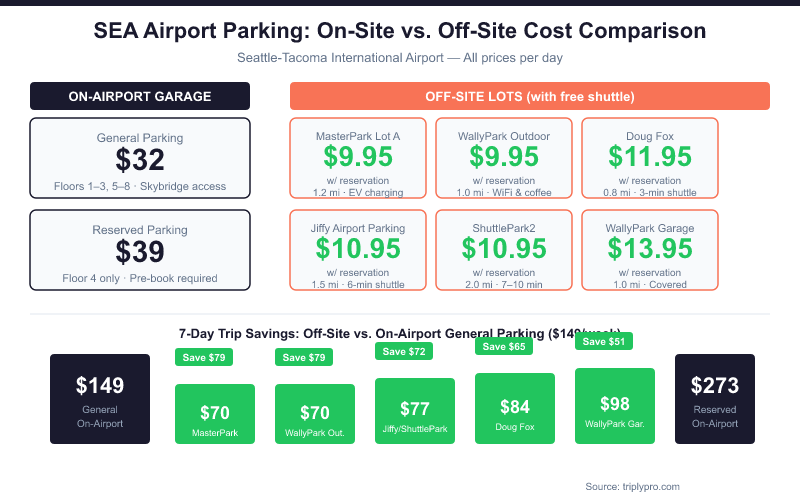 The Seattle-Tacoma International Airport SEA parking garage gives you on-airport convenience at $32/day for General Parking or $39/day for Reserved. For most travelers staying more than a couple of days, off-site lots from $12.95/day offer real savings without sacrificing security or convenience. Every major off-site lot runs free 24/7 shuttles, and most are within 10 minutes of the terminal.