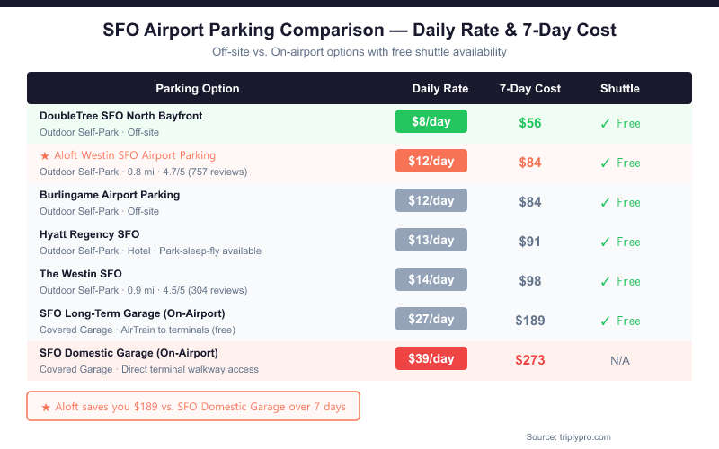 The Aloft Westin SFO Airport Parking lot charges $12/day for outdoor self-parking (verified April 2026), based on current Triply rates. For a 7-day trip, that works out to $84 total — compared to $189 at the SFO Long-Term Garage or $273 at the on-airport Domestic Garage for the same period.