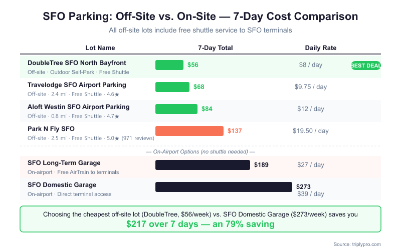The cheapest off-site lot saves you $217 over 7 days compared to the Domestic Garage. Even Park N Fly SFO saves $136.50 over the same period. For a full breakdown of every SFO rate including hourly options, see the Complete SFO Airport Parking Guide.