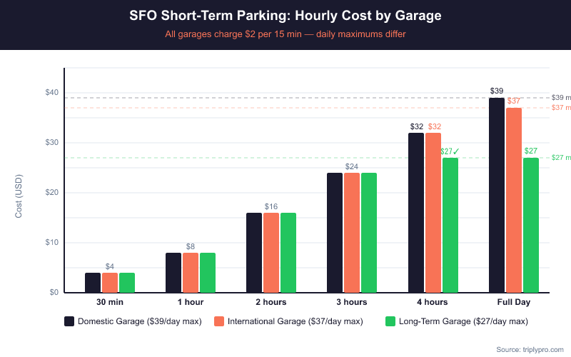 Real-world example: a 2-hour airport pickup costs $16 flat at any SFO garage. A round-trip rideshare for the same trip typically runs $30–$50 with surge pricing. Short-term parking often wins on price — but only if your wait is predictable. A delayed flight can push a $16 stop to a $39 daily max fast.