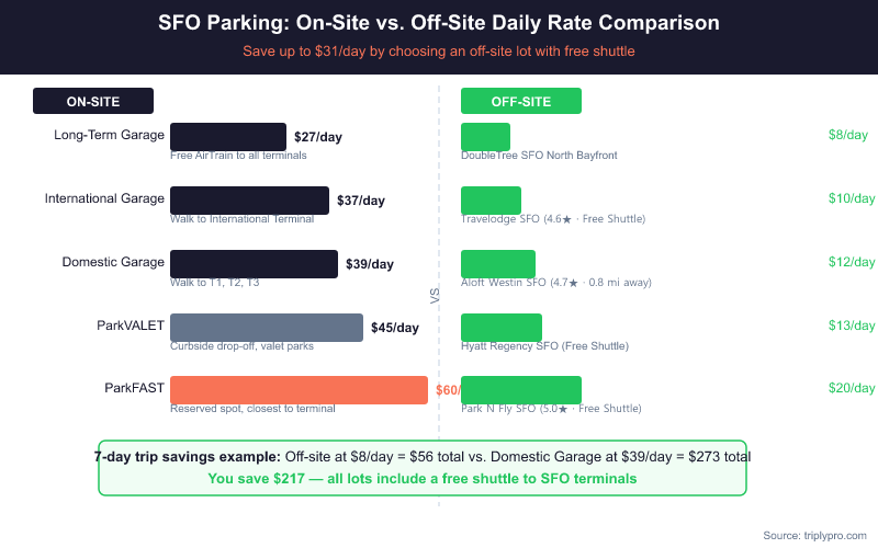 For anyone staying more than a day, off-site lots are the clear winner. See the Complete SFO Airport Parking Guide for a full comparison of on-site and off-site options.