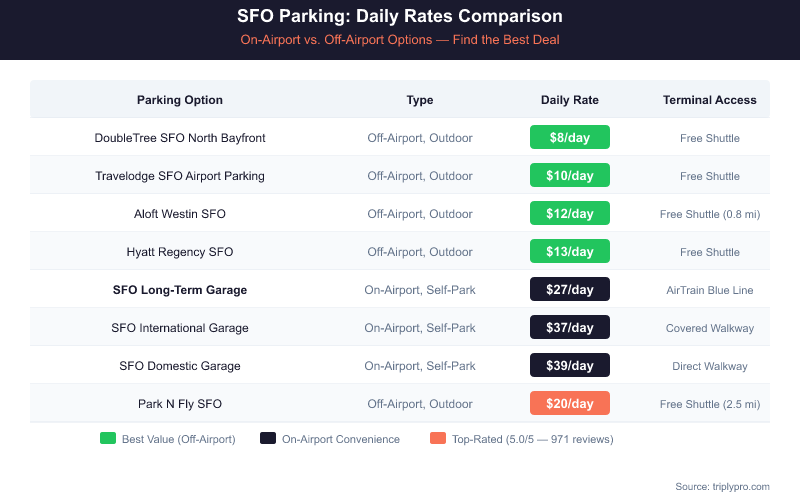 - Off-site lots start at $8/day (DoubleTree SFO North Bayfront) with free shuttles to terminals — a savings of up to 70% vs. on-airport rates.